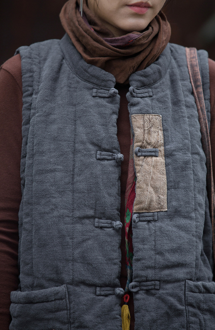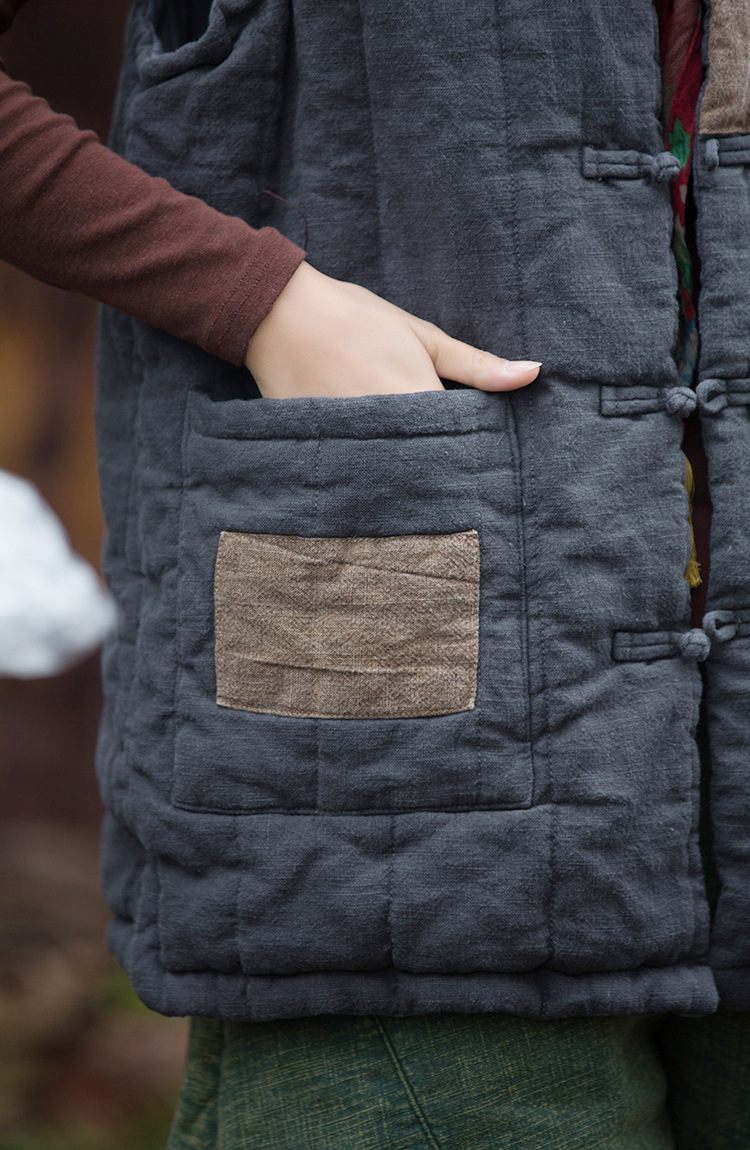 棉麻女装改良苎麻夹棉绗缝贴布外衣复古个性保暖女式马甲