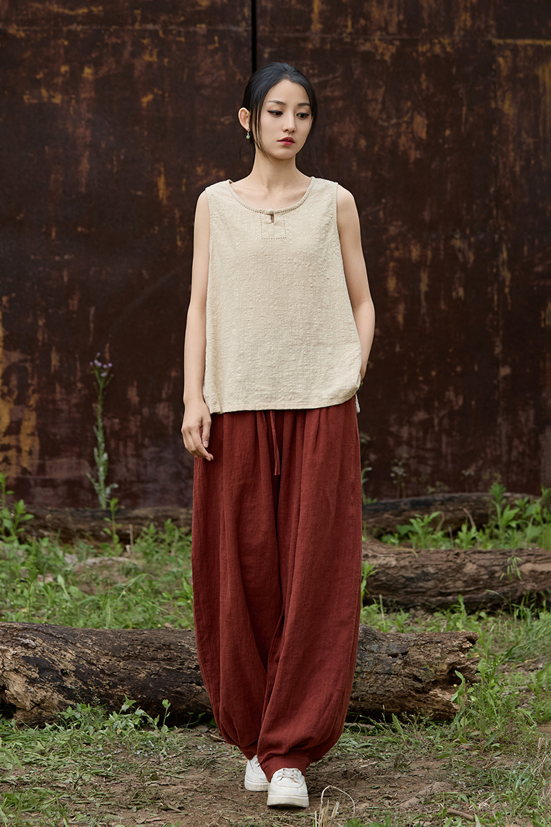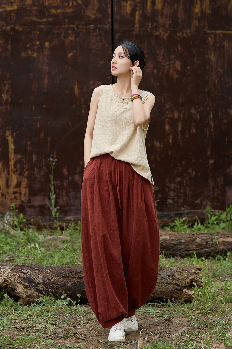 休閒時尚 · 「燈籠褲」苧麻砂洗鬆緊腰繫帶褲